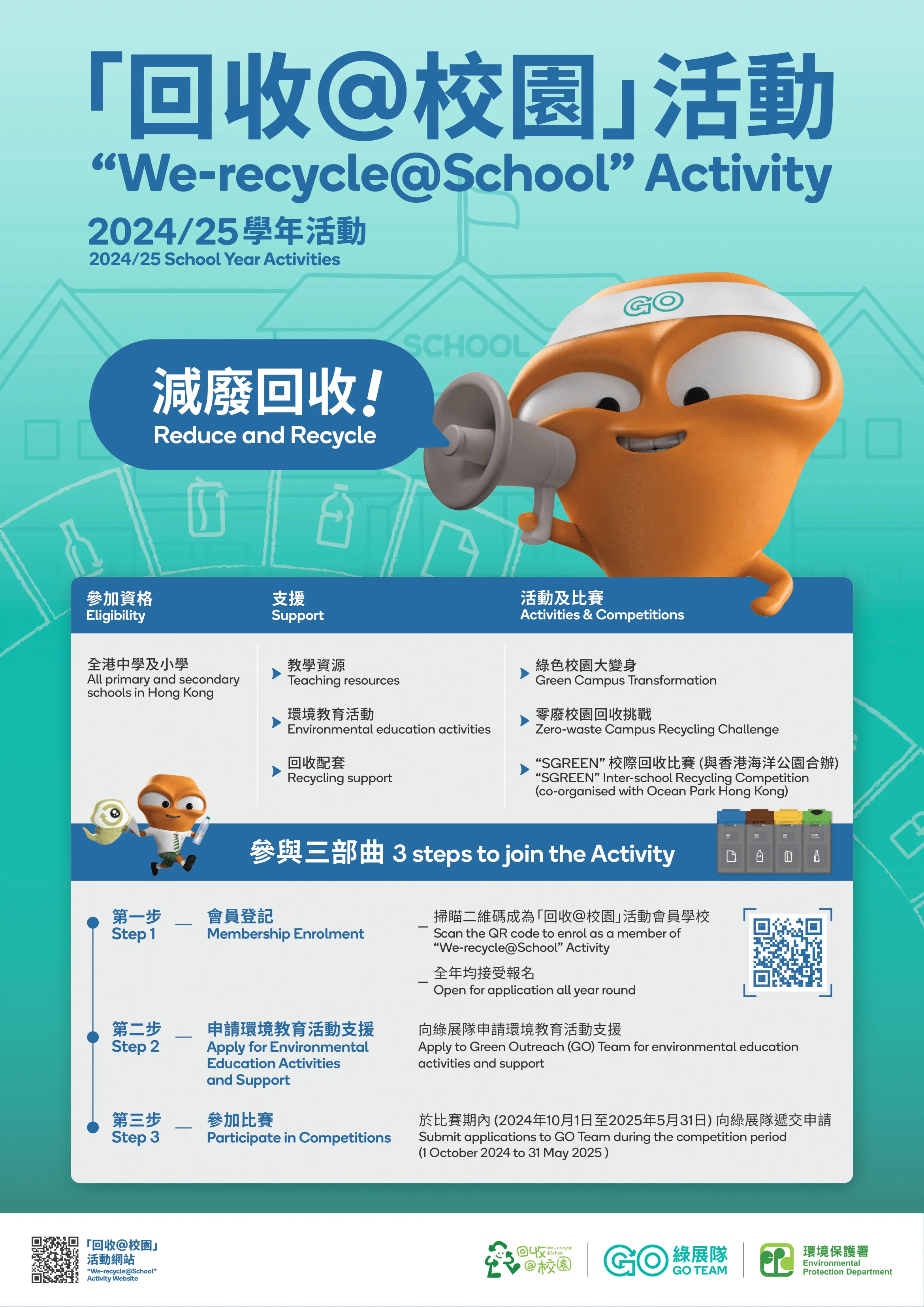 - 第三步 – 参加比赛/奖励活动:参与学校于活动期内透过网上表格递交申请,实践分类回收。