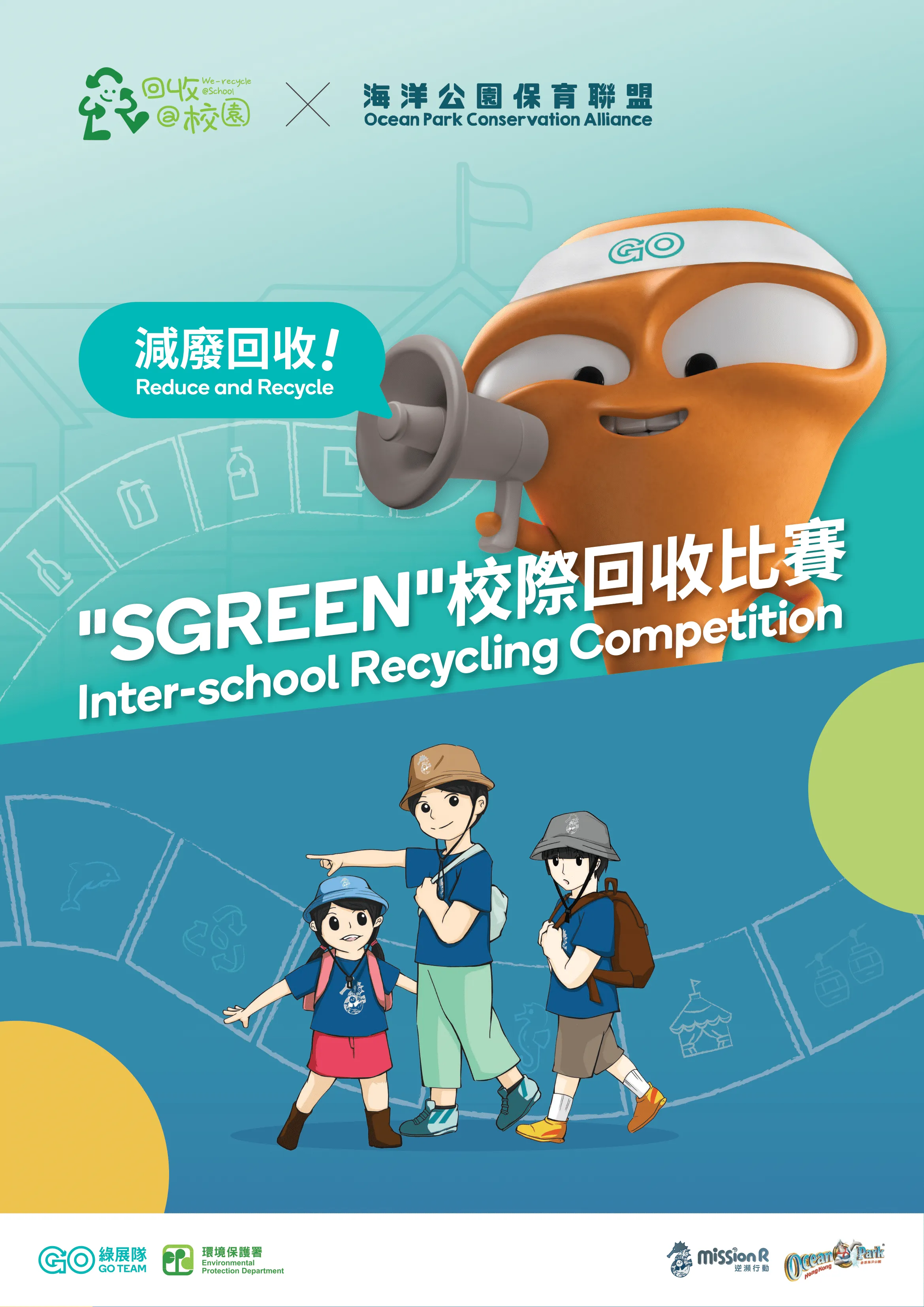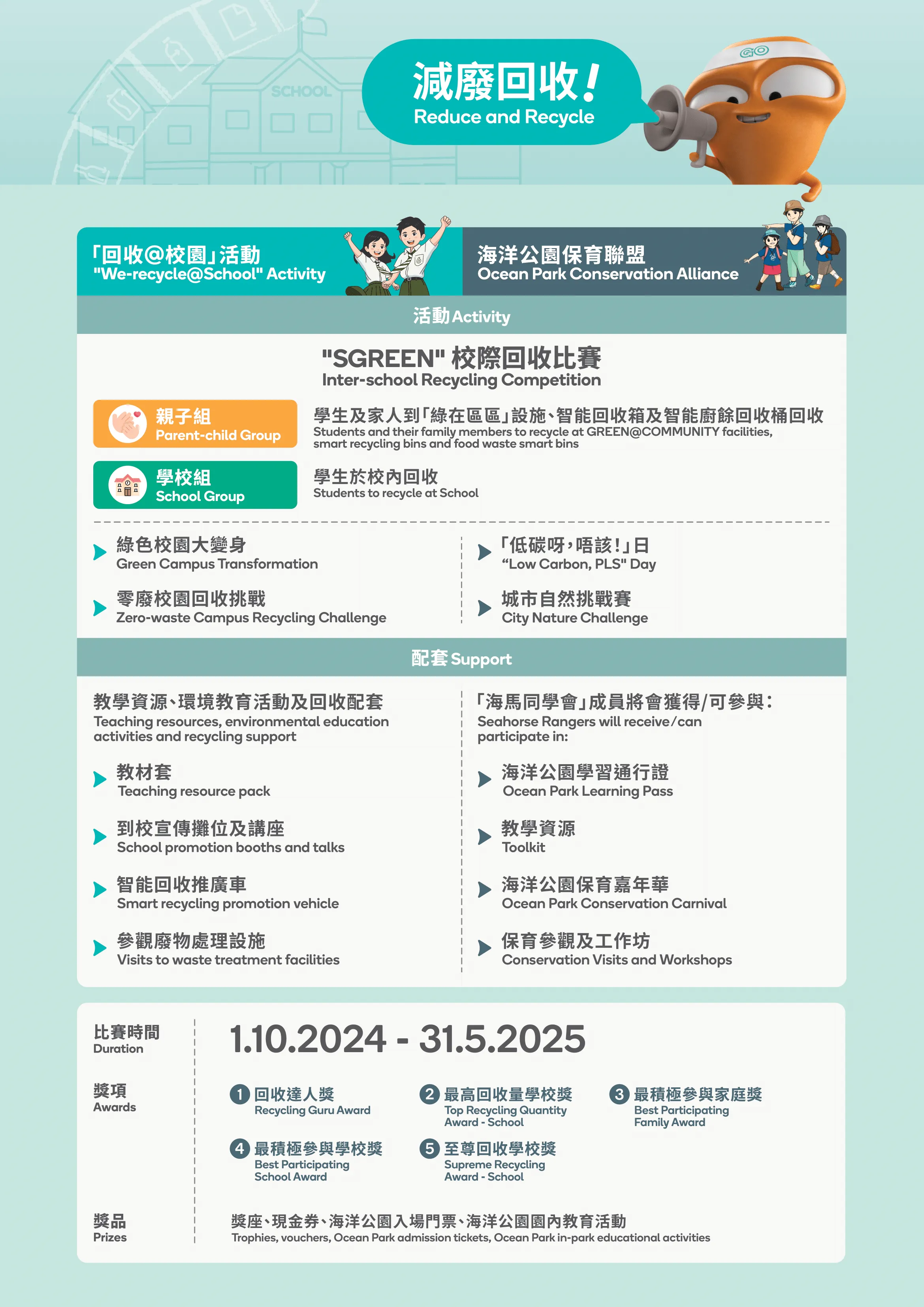 环保署和香港海洋公园于2025年7月5日举办「SGREEN x 回收@校园比赛颁奖典礼」由环境及生态局局长主礼,表扬2024/25学年在减废回收表现卓越的学校、学生和家庭。