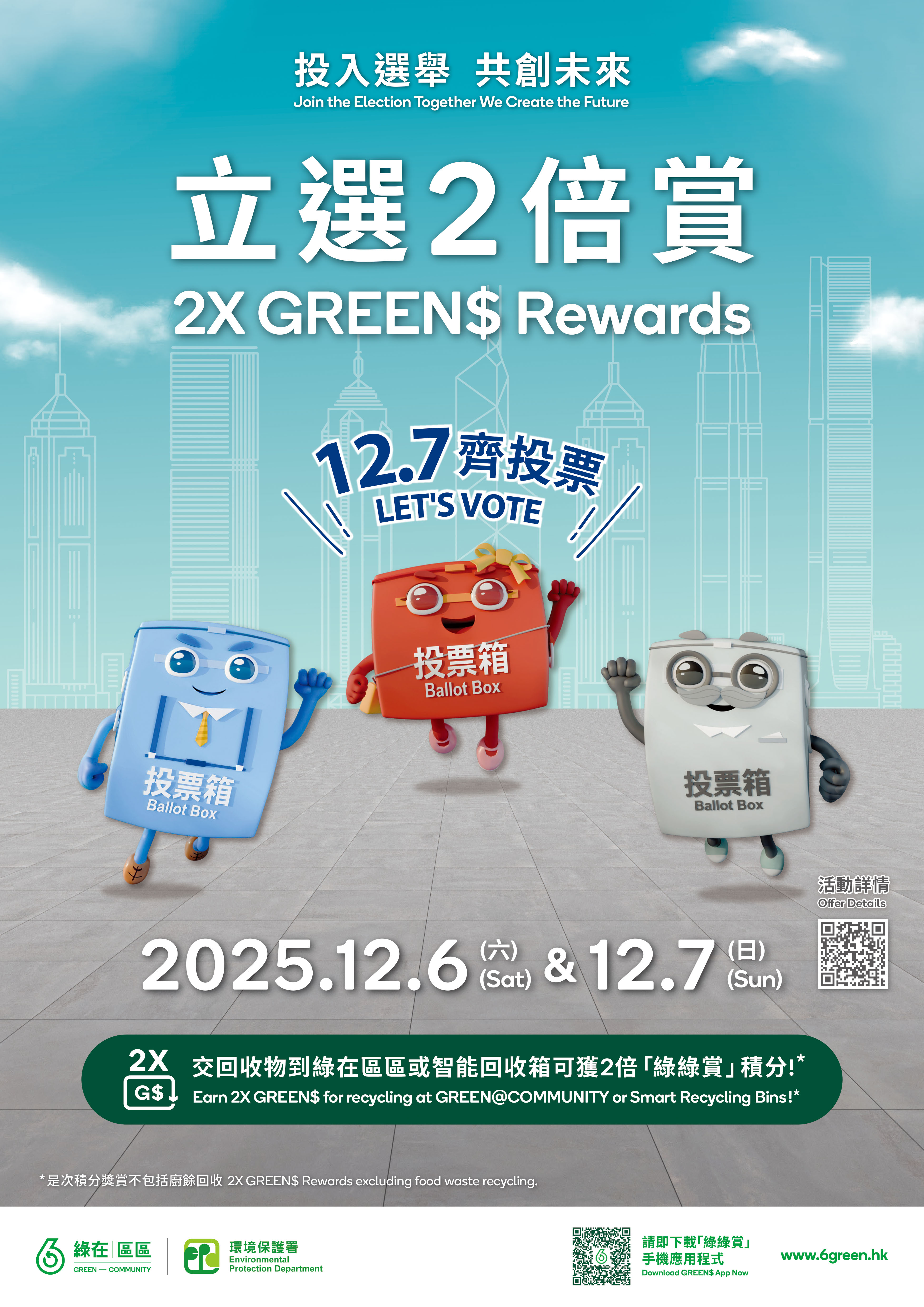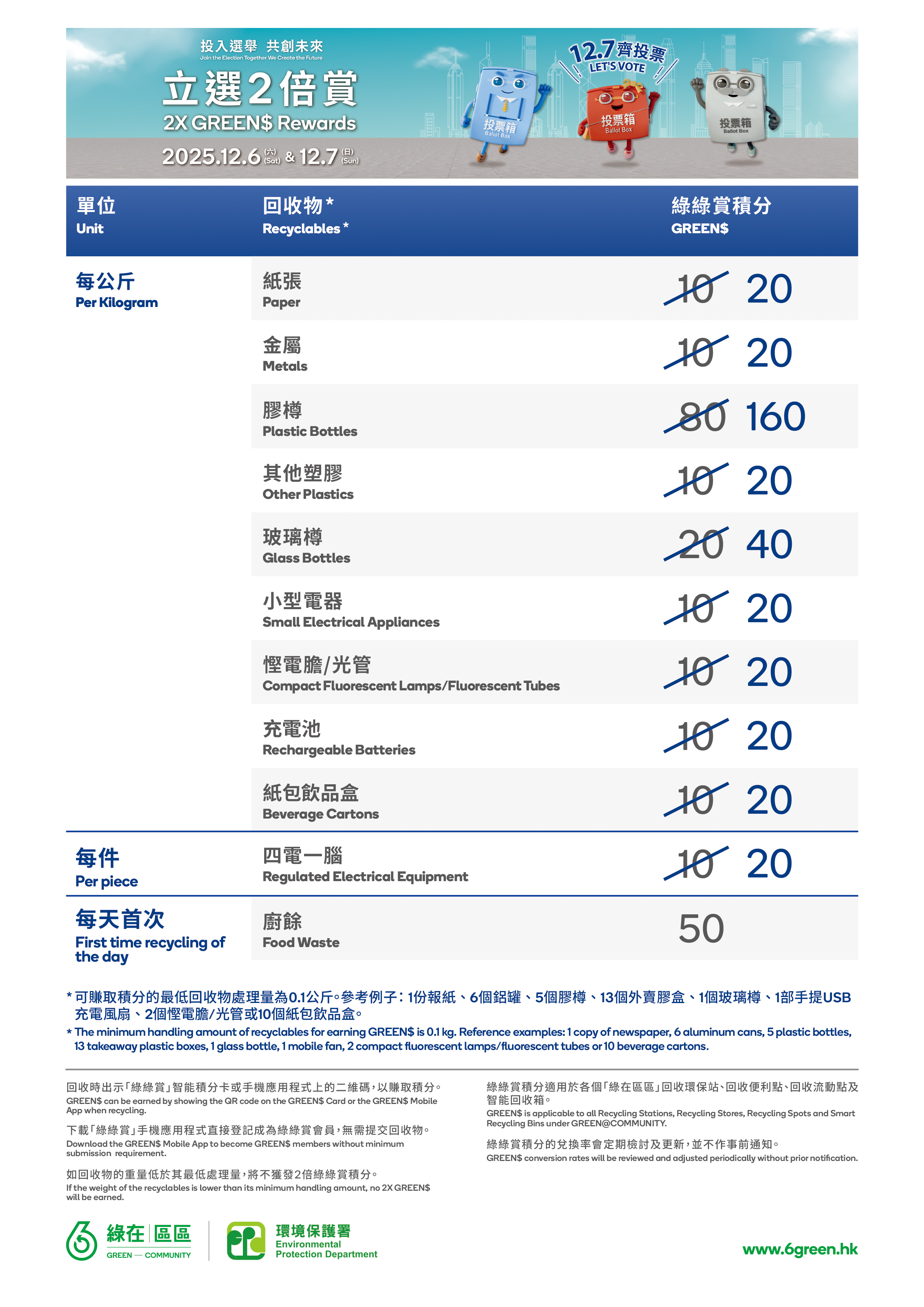 「立選2倍賞」活動 Body 「綠綠賞」會員於2025年12月6日和7日兩天到「綠在區區」任何一個「回收環保站」、「回收便利點」、「回收流動點」或「智能回收箱」提交指定回收物,包括廢紙、金屬、塑膠、玻璃容器、「四電一腦」受管制電器、小型家電、慳電膽/光管、充電池和紙包飲品盒,每類指定回收物均可獲雙倍「綠綠賞」積分。有關雙倍「綠綠賞」積分兌換表請按此。「綠在區區」的詳情請按此。智能回收箱應用點的詳情請按此。環保署保留修改或終止上述優惠之權利,而毋須事先通知。如有任何爭議,一概以環保署之決定為最終裁決。