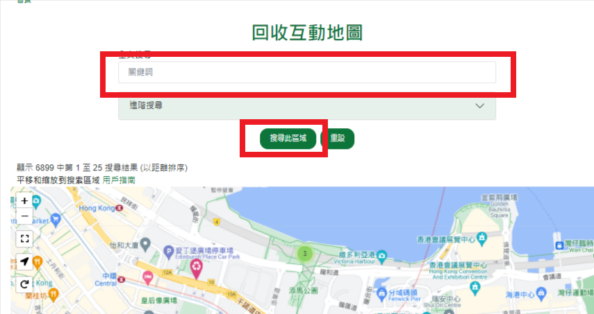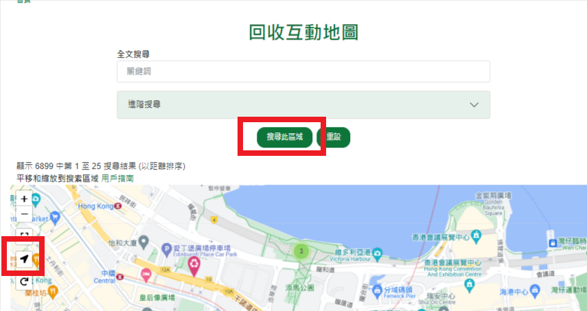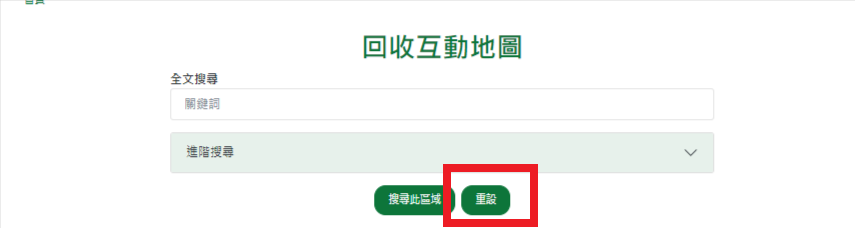 用戶可使用「全文搜尋」功能,在欄位輸入回收點的關鍵字,然後點擊「搜尋此區域」按鈕。