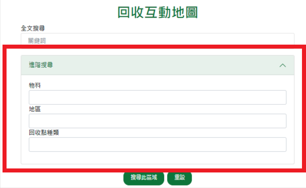 用戶可以點擊「進階搜尋」,在「物料」、「地區」或「回收點種類」選項中選擇關鍵字以進一步篩選搜尋結果。